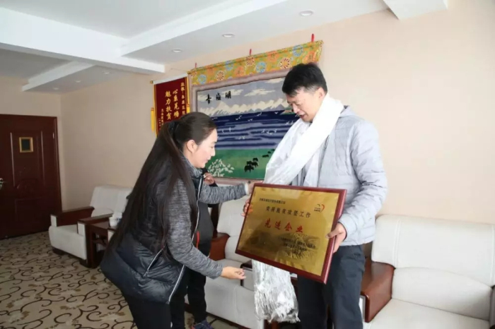 隨后,才旦卓嘎向阜康醫(yī)療股份有限公司黨委書記、董事長王斌頒發(fā)"脫貧攻堅工作先進企業(yè)”匾牌。
