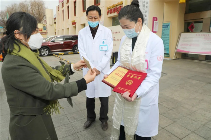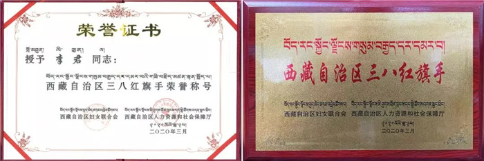 由于目前處于新冠肺炎疫情期間,兩位領(lǐng)導(dǎo)親自將此次榮譽(yù)送到阜康,雖然表彰儀式簡單,但卻意義非凡。西藏自治區(qū)人力資源和社會保障廳巡視員劉莉?yàn)槔罹洪L獻(xiàn)上了潔白的哈達(dá)和"西藏自治區(qū)三八紅旗手”榮譽(yù)證書及獎(jiǎng)牌,并勉勵(lì)道: