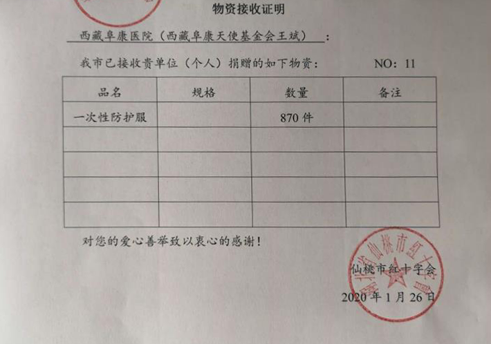 1月26日,在公司黨委書記、董事長王斌先生的指示下,阜康醫(yī)療緊急向湖北仙桃市紅十字會(huì)捐贈(zèng)了價(jià)值10萬元的870套防護(hù)服,隨后在2月28日分別向湖北省紅十字會(huì)、仙桃市紅十字會(huì)捐款100萬元和10萬元,支持湖北省和仙桃市"抗擊新冠肺炎項(xiàng)目”。