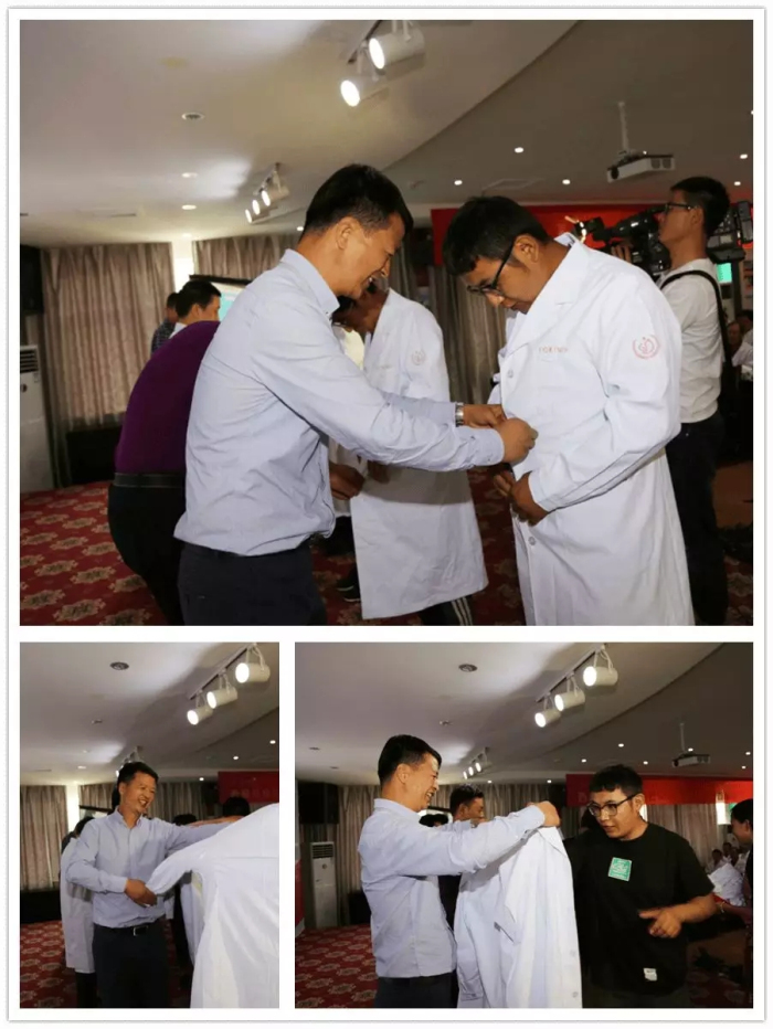 會議舉行了換裝儀式。王斌、陳彬、孫貴林、李君、李勇、何靜等院領(lǐng)導(dǎo)為醫(yī)師代表換上整潔的新式白大褂,向醫(yī)師代表贈送了首屆醫(yī)師節(jié)紀(jì)念禮物;汪麗、李勇、徐勝柱、扇敏娜、李生隆等一起為全體醫(yī)師分發(fā)慶祝蛋糕,讓每一位在場醫(yī)務(wù)人員品嘗到濃濃的節(jié)日甜蜜。
