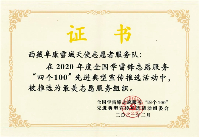 在2020年度全國學雷鋒志愿服務(wù)"四個100”先進典型宣傳推選活動中,西藏阜康雪域天使志愿者服務(wù)隊榮獲"最佳志愿服務(wù)組織”榮譽稱號。